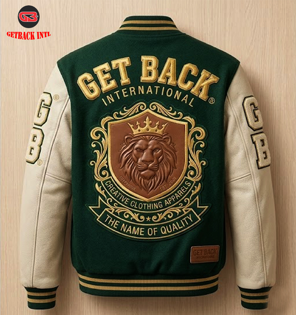The chest is adorned with a custom "GB" chenille patch and our iconic crowned lion head. On the reverse, the "Get Back International" crest is rendered in multi-textured embroidery and high-relief embossing, centered around a stunning tan leather shield. It’s the ultimate statement piece for those who demand quality without compromise.